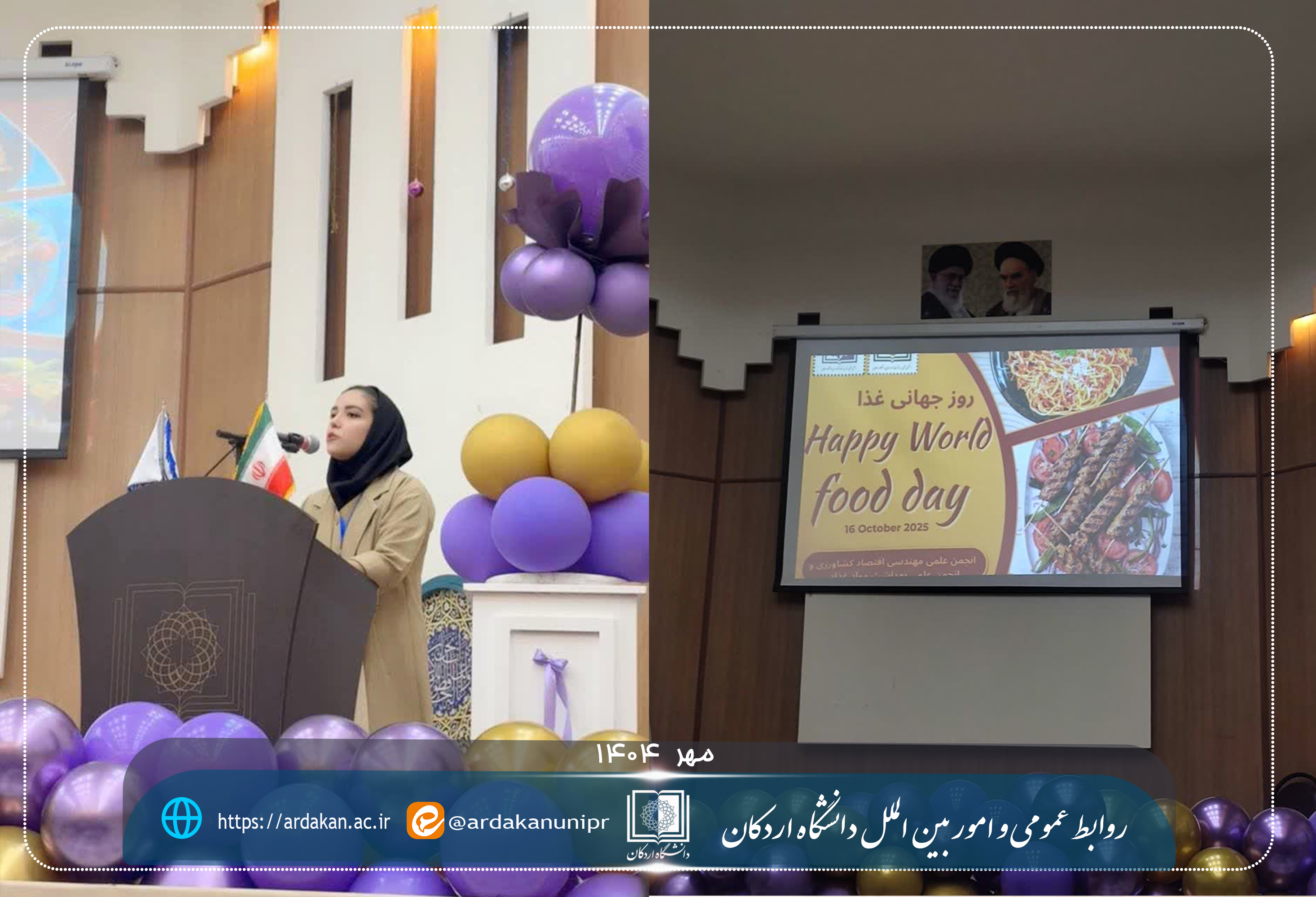 به مناسبت روز جهانی غذا و تأسیس رشته علوم و مهندسی صنایع غذایی، جشنواره‌ای با عنوان «جشنواره غذا» روز دوشنبه ۲۸ مهرماه ۱۴۰۴ در دانشگاه اردکان برگزار شد.